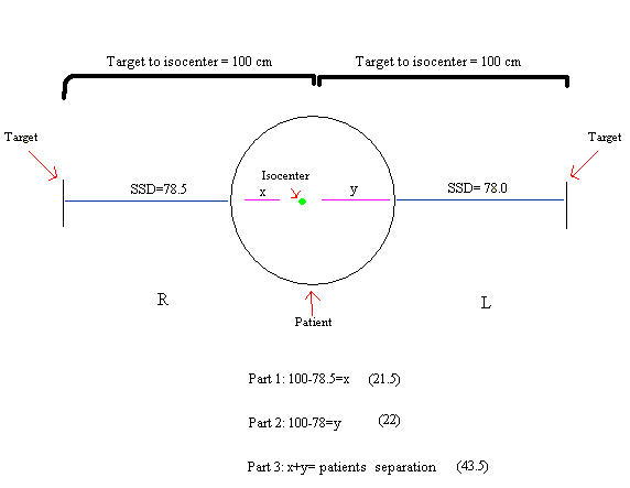 A large patient is being treated for prostate cancer. The patient is supine, and on the right lateral an SSD of 78.5 cm was measured. On the left lateral an SSD of 78.0 cm was measured. In the lateral plane, what is the separation for this patient?