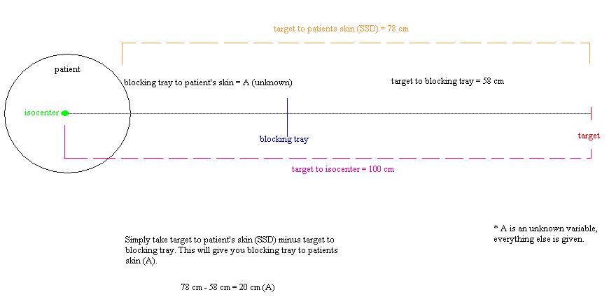 Looking at the diagram below will hopefully explain how to come up with this answer. You know isocenter to the target is 100 cm, and that the SSD also called TSD is from source/target to skin surface. If you can not do this problem in your head, drawing it out helps a lot!